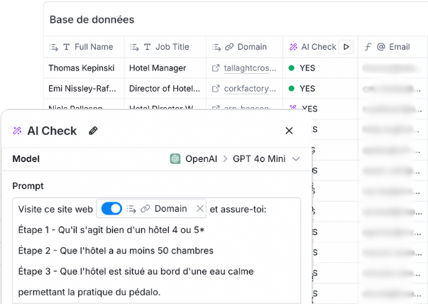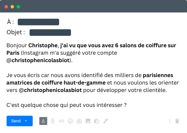 Une base de données de plus d’un million de comptes Instagram professionnels a été constituée. À partir des données disponibles via le bouton "contacts" sur Instagram, notre système récupère emails et numéros de téléphone. Utilisation de l'IA pour analyser la biographie Instagram et le site internet de chaque entreprise pour filtrer avec précision (localisation, secteur etc.) afin de ne cibler que les prospects correspondant aux critères de l'Agence OVB.